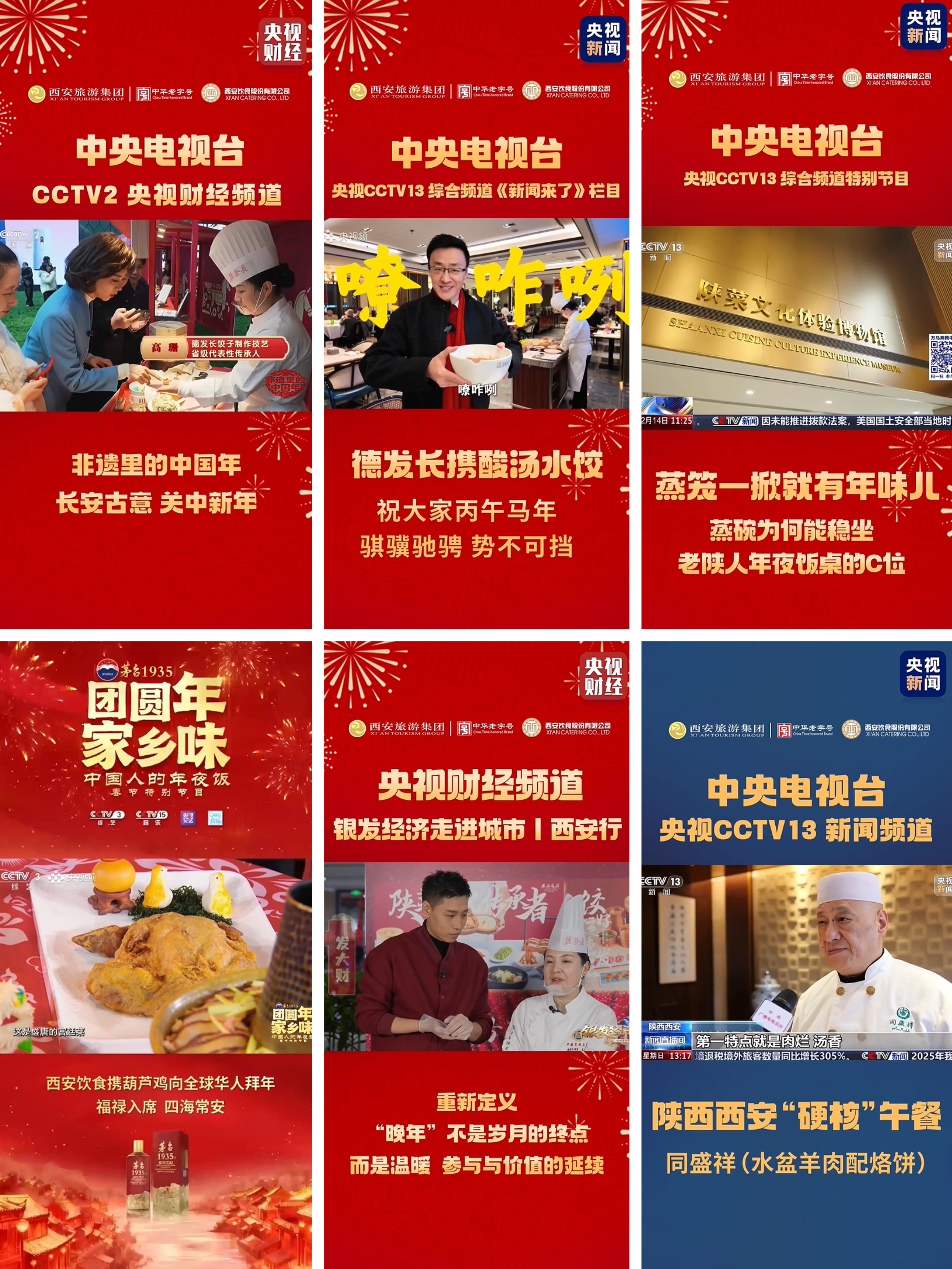 春節(jié)期間,西安飲食獲央視六大欄目多次報道,同盛祥水盆羊肉、西安飯莊葫蘆雞等亮相《我的午餐》《團(tuán)圓年家鄉(xiāng)味》等節(jié)目;德發(fā)長餃子技藝于《非遺里的中國年》展示,并在除夕央視春晚倒計時環(huán)節(jié)向全國觀眾拜年。新華社刊發(fā)《老字號闖新路》,聚焦陜菜文化體驗博物館,全網(wǎng)傳播量超180萬;中國新聞網(wǎng)報道《八道蒸碗真豪情 關(guān)中“硬菜”迎客來》,獲國際媒體轉(zhuǎn)載,助推陜菜文化出海?!蛾兾魅請蟆奉^版頭條肯定其文化營銷創(chuàng)新,省市級媒體形成全媒體傳播矩陣,總瀏覽量破億。